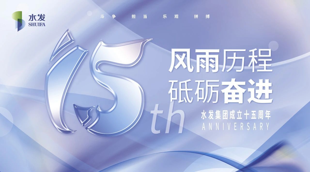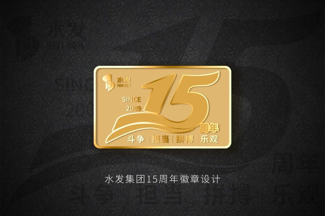 水發(fā)集團因水而興,從2009至2024年已走過15個春秋,數(shù)字“15”結(jié)合流動的水來設(shè)計,并結(jié)合了“斗爭、擔當、拼搏、樂觀”的新水發(fā)精神,金色的徽章更顯品質(zhì)。