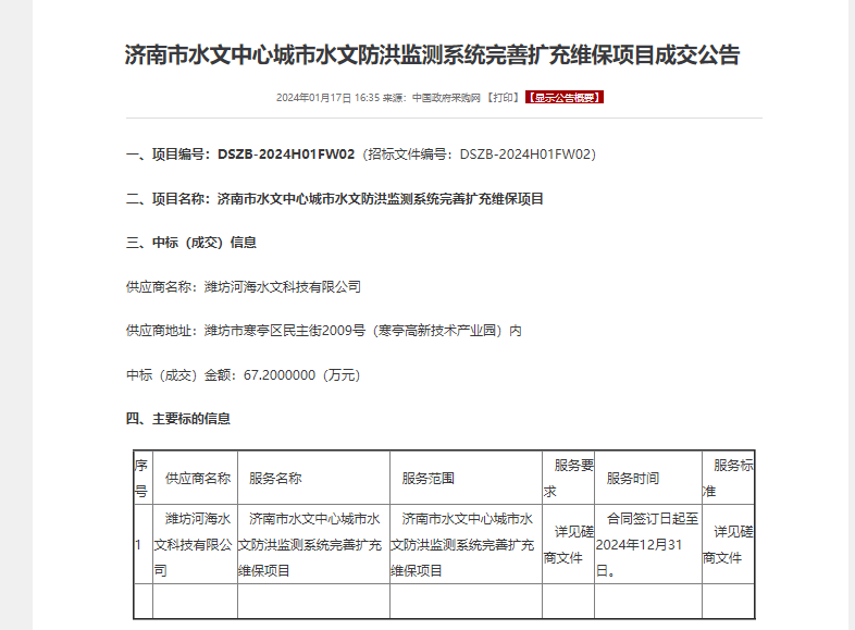 濟南市水文中心城市水文防洪監(jiān)測系統(tǒng)完善擴充維保項目,項目金額67.2萬元,主要服務內容為濟南市城市水文防洪監(jiān)測系統(tǒng)完善擴充項目已建站點的日常運行維護、保養(yǎng)、檢修,保障自動測報設備正常運行,使信息化平臺更好服務于防汛監(jiān)測和指揮調度。